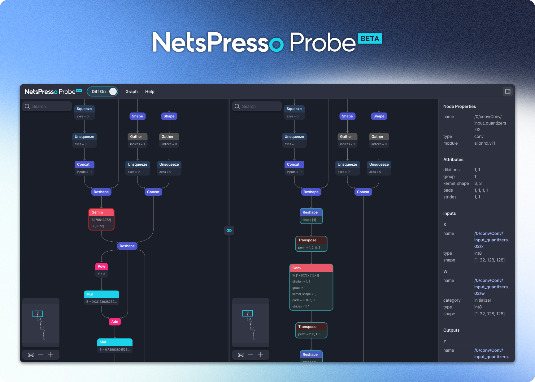 Probe is a specialized tool for visualizing model graphs and comparing structural differences before and after optimization. Understanding the architecture of Transformer-based models is often challenging. To help developers better interpret their models, Nota AI has made this graph visualization capability freely available. Because understanding the model structure is the starting point for effective optimization.